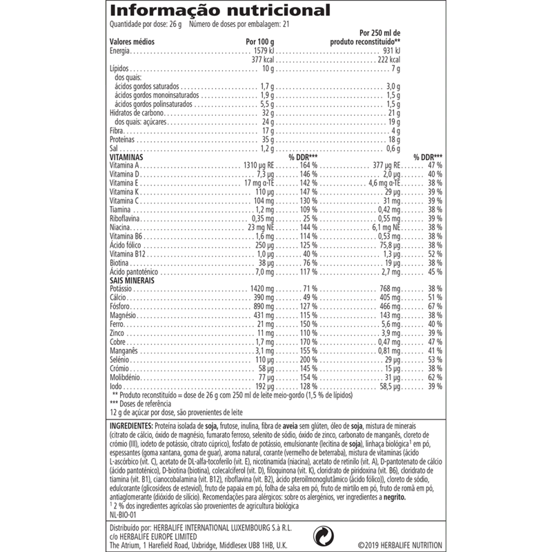 • 221 kcal por dose. • 18 g de proteína por dose, que contribui para o crescimento da massa muscular. • 4 g de fibra por dose. • Fornece, no mínimo, 38% da dose diária recomendada de 25 vitaminas e minerais por dose, incluindo crómio, que contribui para a manutenção de níveis normais de glicose no sangue. • Ingredientes veganos, sem glúten e com aromatizantes naturais. Uso • Beba um batido Fórmula 1 todos os dias, como uma refeição nutritiva. Agite ligeiramente a embalagem antes de cada utilização para redistribuir o conteúdo. Misture 2 colheres de sopa (26 g) de pó com 250 ml de leite meio-gordo frio (1,5% de lípidos). • Integre o consumo deste produto numa dieta alimentar equilibrada e variada, aliada a um estilo de vida ativo e saudável.