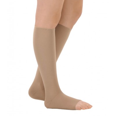 • Meias de compressão bege até ao joelho com ponta aberta
